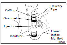 (e) Install the injector to the delivery pipe and lower intake manifold as shown in the illustration.